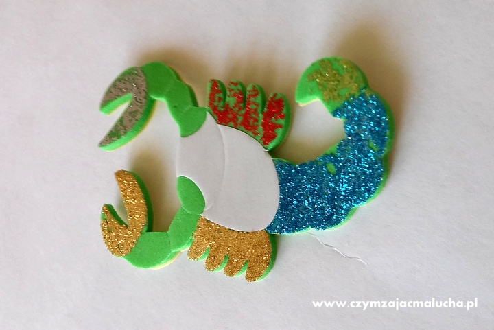 Przy tego typu zabawach zawsze dajemy Maluchowi wolną rękę. Może tworzyć dzieła według własnego uznania. Bo kto powiedział, że krab nie może mieć zielonej głowy i być kolorowy jak tęcza?