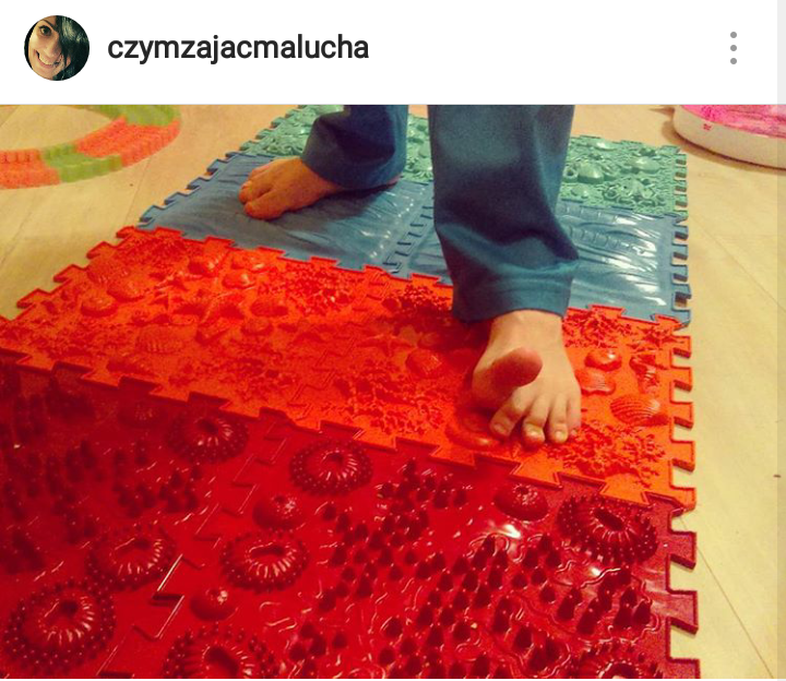 To mata sensoryczna, wspierająca prawidłowe napięcie mięśniowe w nogach i ćwiczenia z zakresu integracji sensorycznej. Jest gumowa i składa się z 8 puzzli, dzięki czemu można ją dowolnie układać. Jest łatwa w czyszczeniu. Są różne rodzaje elementów – miękkie i twarde. Maluch ma dwie takie maty i ma je rozłożone przy wejściu do pokoju. W domu chodzi bez kapci (na boso lub w skarpetkach), więc minimum kilka razy dziennie po niej przechodzi. Wszystkie dzieci, które do nas przychodzą chętnie po tym maszerują. W przeciwieństwie do dorosłych ;) Dla mnie chodzenie po macie jest bolesne.