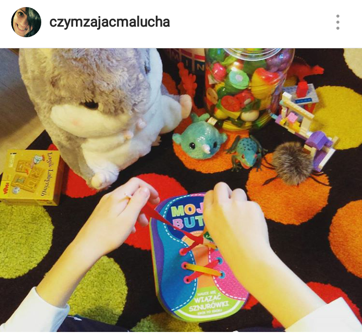 Książka do nauki wiązania butów —-> KLIK. Świetnie się u nas sprawdziła i Maluch potrafi już samodzielnie wiązać na kokardkę. Wprawdzie z samej treści nie korzystaliśmy, ale sznurowadła skutecznie zachęciły Malucha do wiązania. Książka jest poręcznego formatu, więc można ją zabierać ze sobą i ćwiczyć nie tylko w domu. Przyznaję, że nie wierzyłam, że może nam pomóc, a jednak się przydała.