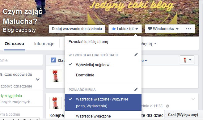 Jedna z czytelniczek podpowiedziała mi, co zrobić, żeby wpisy na facebooku się wyświetlały. Spróbujcie, może faktycznie ten sposób okaże się skuteczny. Najeżdżając na ikonkę “lubisz to” należy zaznaczyć ptaszkiem dwa miejsca – wyświetlaj najpierw i powiadomienia wszystkie włączone.