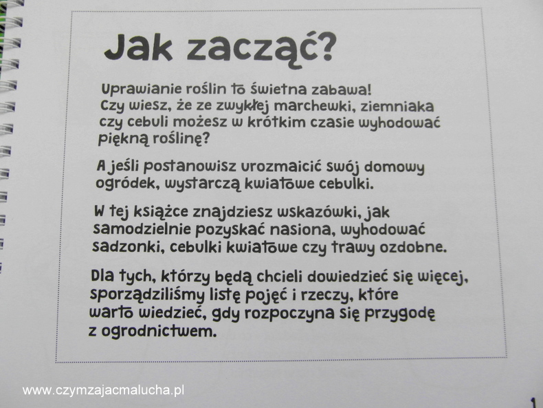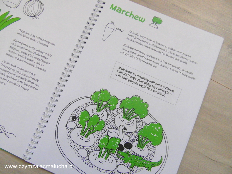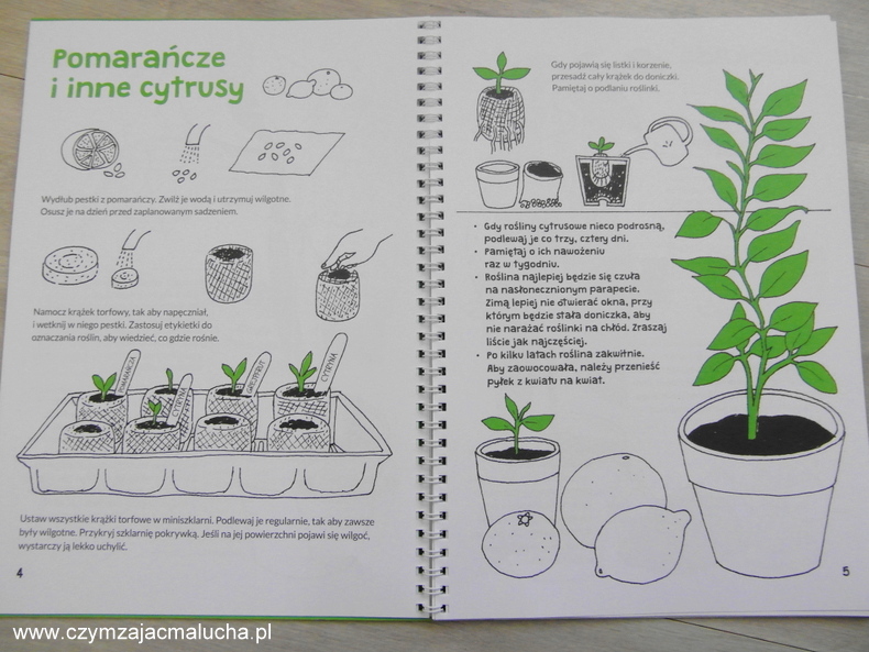 Tekst książki jest napisany przystępnym dla dzieci językiem. Nie ma tu przeładowania informacjami. To duży plus przy tego typu poradnikach. Bardzo spodobały nam się ciekawostki. Korzystając z zaproponowanych przez autorów sposobów Maluch zasadził m.in. paprykę. Wziął również w obroty marchewkę (przygotował sobie zaproponowane w książce jezioro) i cebulę. Kusi nas również próba wyhodowania cytryny. Z pewnością się za to zabierzemy.