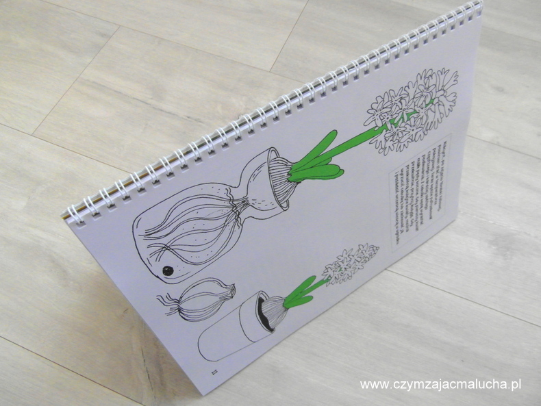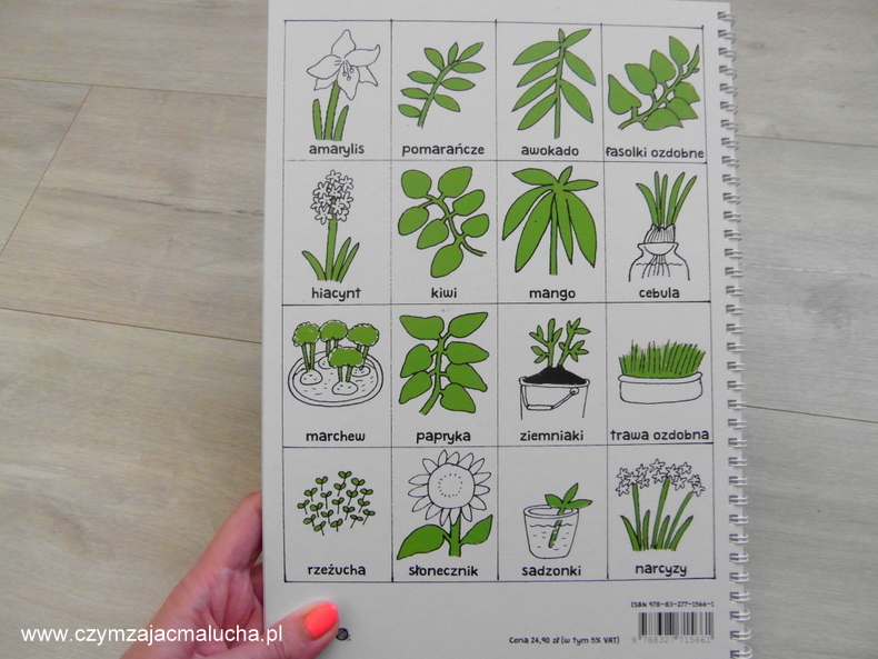 Książka ma twardą okładkę i ma wygląd skoroszytu. To bardzo ułatwia zerkanie do poszczególnych stron. Ilustracje są bardzo proste i świetnie uzupełniają tekst. Według mnie jest to książka w sam raz dla przedszkolaków, ale nie tylko. Dzieci w wieku szkolnym też zainteresuje, a maluchy przy pomocy rodziców również mogą próbować swych sił w hodowaniu pierwszych roślin (oczywiście zakładając, że jedzenie ziemi nie leży w kręgu ich zainteresowań).