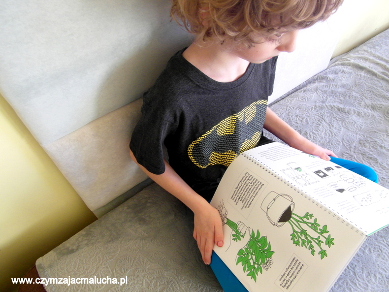 Maluch już od dawna wykazuje duże zainteresowanie nie tylko zwierzętami, ale również roślinami. Bardzo chętnie pomaga tacie w różnych pracach na działce. Sadzą tam kwiaty i warzywa, doglądają je, więc papranie się w ziemi nie jest Maluchowi obce. Czułam, że ta książka ma potencjał, który Maluch z chęcią wykorzysta ;)