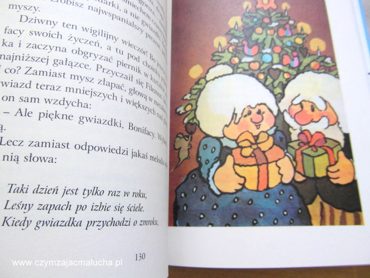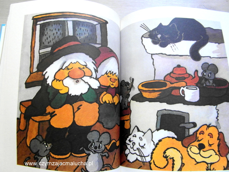 Tekst niby jest krótki, ale według mnie nie zawsze łatwy w przyswojeniu przez dziecko. Maluch w kilku momentach domagał się ode mnie szerszych wyjaśnień kontekstu. Tekst jest rymowany.