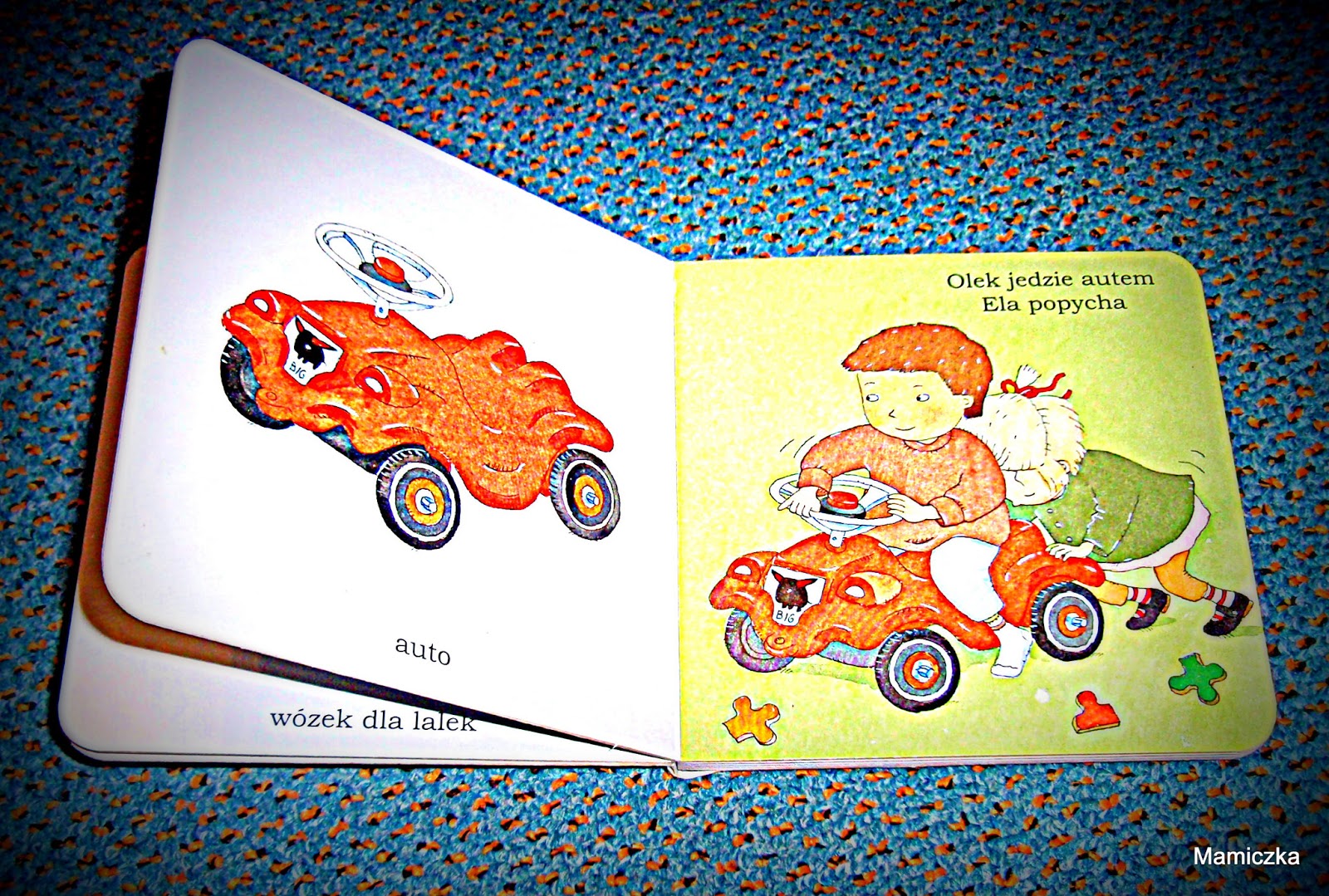 W książce “Ela i Olek jeżdżą” mamy pokazany m.in. rower, wózek, samochód i zjeżdżalnię.