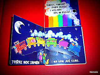 Prezentacja pociągu zaczyna się od lokomotywy (wtedy pojawia się pierwsza wstążka) i potem kolejno, wraz z każdym wagonem, dochodzi następna. Mój Maluch uwielbia patrzeć, jak one wychodzą. Od razu bada paluszkami, co jest pod nimi i skąd się tu wzięły.
