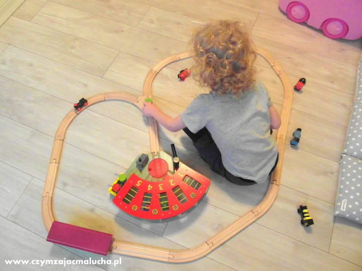 Do tej pory nie mieliśmy jeszcze żadnej parowozowni, ale Maluch miał kontakt z czymś podobnym w sali zabaw. Bardzo go ten zestaw ucieszył. Nie musiałam mu niczego tłumaczyć, od razu wiedział co to jest i podjechał tam swoimi lokomotywami. Do zestawu nie są dołączone żadne pociągi ani tory, więc trzeba się posiłkować swoimi.