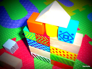 Są tam różne kolory, kształty i wzory. Producent wskazał, że przeznaczone są dla dzieci powyżej 1 roku życia. My zaczęliśmy ich używać nieco wcześniej. Dzięki różnym kształtom możemy z nich budować zarówno proste wieże, jak i zamki z łukiem. Wieżę muszę budować ukradkiem, żeby udało się ją stworzyć do końca. Nie postała jeszcze dłużej niż 20 sekund, bo Maluch woli nieład z klocków na podłodze, ale kolejne próby dzielnie podejmuję.