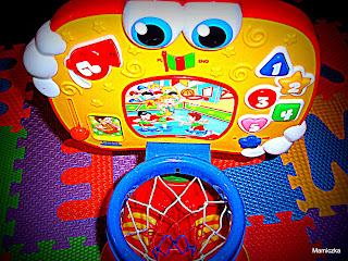 Po kilku minutach takiej zabawy jestem już poirytowana (delikatnie mówiąc) i szukam czegoś, czym możemy się pobawić na siedząco. Jedną z takich zabawek jest Moja pierwsza koszykówka Clementoni. Jest fantastyczna!