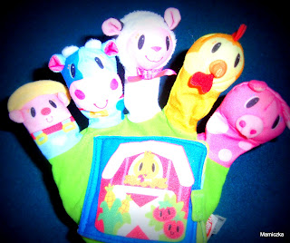 Nasza ulubiona to farma z Playskool Hasbro (ta sama firma, z której mamy —> stojak gimnastyczny). Malucha odwiedza świnka, kura, owca, krowa i farmer. Przy zabawach pacynkami odgłosy paszczowe są obowiązkowe, więc o ile ze zwierzakami nie ma problemu, to z farmerem już nie było tak łatwo. Ostatecznie stanęło na tym, że farmer woła hop, hop, ale jeśli macie jakiś inny pomysł na jego odgłos paszczowy to czekam na propozycje :) Pacynka ma dodatkowo miękką, piszczącą książeczkę, która urozmaica nam zabawę.