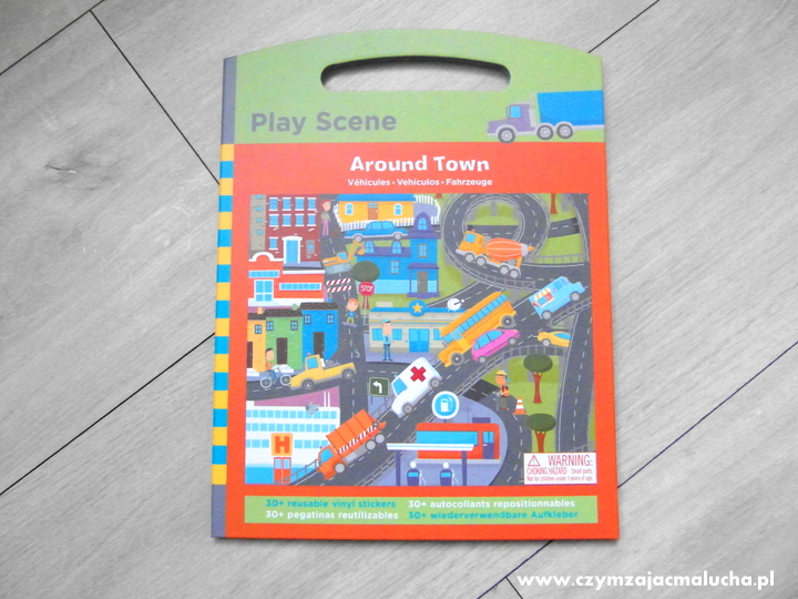 Zestaw składa się ze sztywnej, składanej na pół planszy. Jest tam obrazek z miastem. Do tego dołączone są “naklejki”, które można dowolnie zamieszczać na planszy. Naklejki nie są tak naprawdę takimi klasycznymi naklejkami, bo pod spodem nie mają klejącej się nawierzchni. Kiedy spróbujecie przykleić je np. do zwykłej kartki – nie da się. Odpadną od razu. To duży plus, zwłaszcza, jeśli dziecko lata z naklejkami po całym pokoju. Za to na planszy trzymają się świetnie. Można je dowolnie przyklejać, odklejać, stawiać planszę pionowo i nic nie odpada.